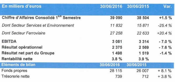 Environmental and Services division (30% of the global turnover) is decreasing of 25.4% turnover. In spite of this decrease achieved sales are within budget forecasting, primarly from inputs from exceptional PO ends realized in 2015 repairs to the HF2 blast furnace Arcelor in Dunkirk (France). On the other hand, all the division's other businesses reported growth, mainly through to industrial solutions for waste treatment and water treatment engineering are increasing. Solutions has a good order book allowing continous workload for second half 2016. Operational outcome for this division get 315K€ giving 2.7% compared to 1,165K€ as of June 30th 2015